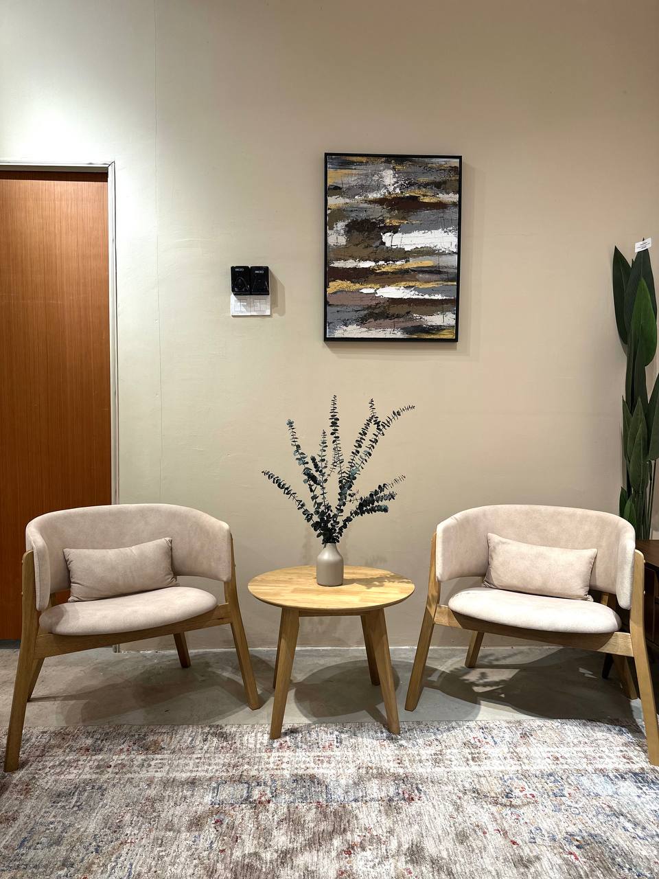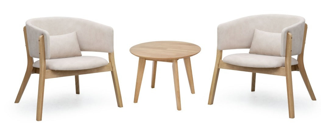 A cozy and stylish set for your living space. Made from solid wood with a soft beige fabric seat. Perfect for Japandi, Muji or minimalist homes.